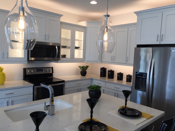 Kitchens in the condos are modern and pretty, with pendant lighting, multi-level cabinets and a breakfast bar.